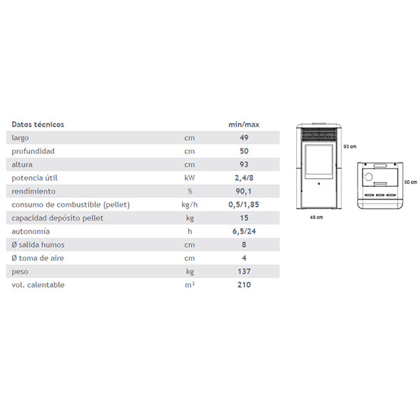 Color: Gris POINT KW 8 Fuego de vermiculita Panel sinoptico Salida de humos 8 cm diametro lateral derecha e izquierda, posterior y superior Programacion diaria/semanal Telecomando en dotacion Laterales de acero top y perfiles laterales de ceremica Datos técnicos min/max largo cm 49 profundidad cm 50 altura cm 93 potencia útil kW 2,4/8 rendimiento % 90,1 consumo de combustible (pellet) kg/h 0,5/1,8 capacidad depósito pellet kg 15 autonomía h 7/24 Ø salida humos cm 8 Ø toma de aire cm 4 peso kg 130 vol. calentable m³ 210